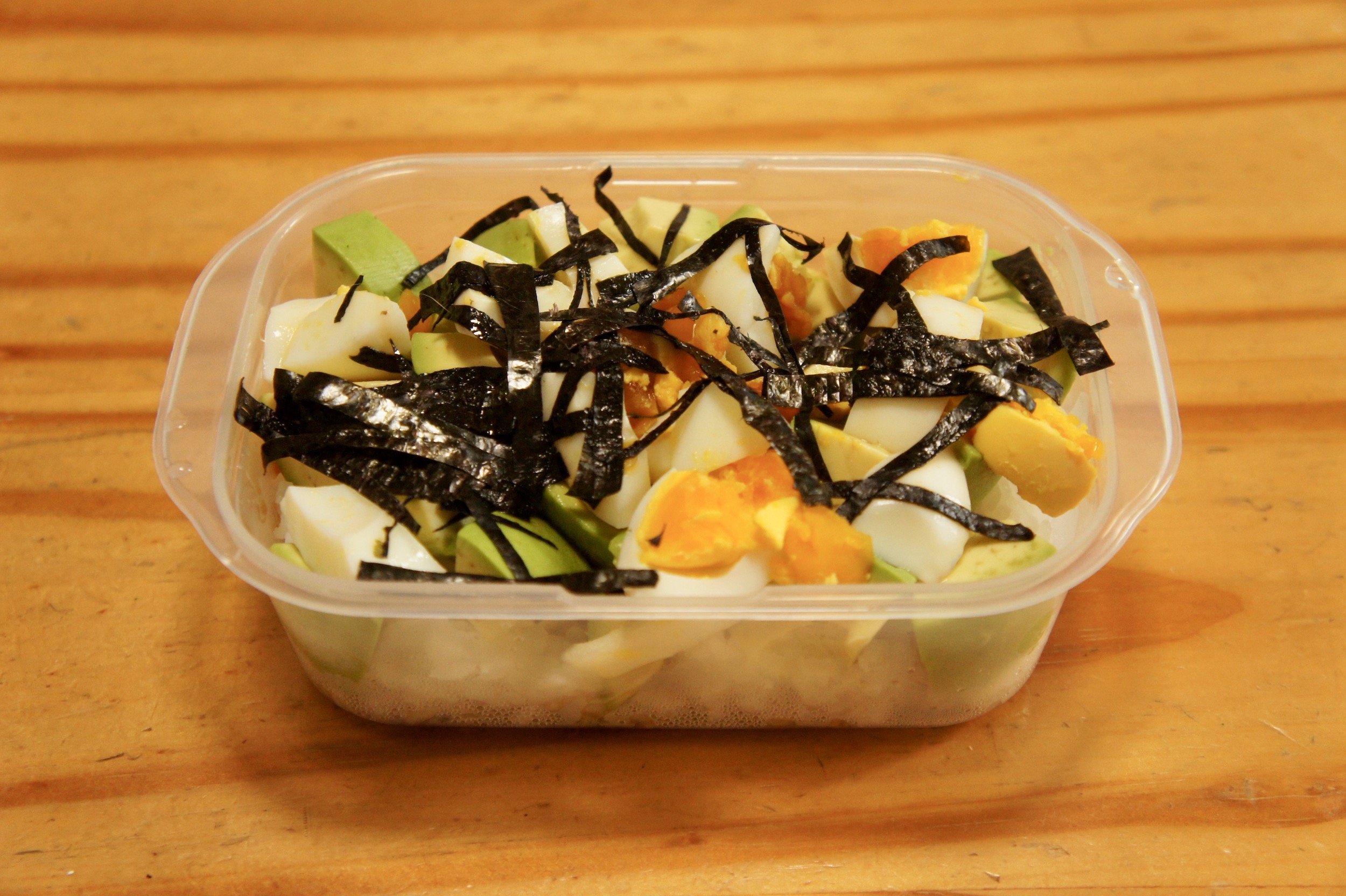 超時短のアボカド丼弁当。ご飯の上に茹でておいた卵とアボカドと千切りした海苔をかけて、めんつゆをかけたもの。アボカドは少し古くなりかけたようなのを使うとお昼頃には真っ黒になるので、やっと食べごろになったかな、ぐらいのアボカ…