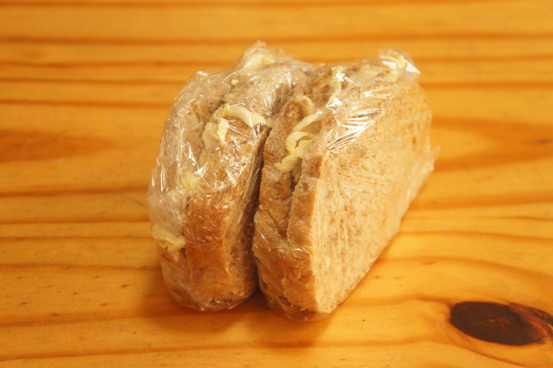ライ麦パンにチーズをのせてトーストしてから、手作りのサラダチキンとキャペツの千切りとマヨネーズをかけたサンドイッチ。これは、度々作りたくなる味かも。