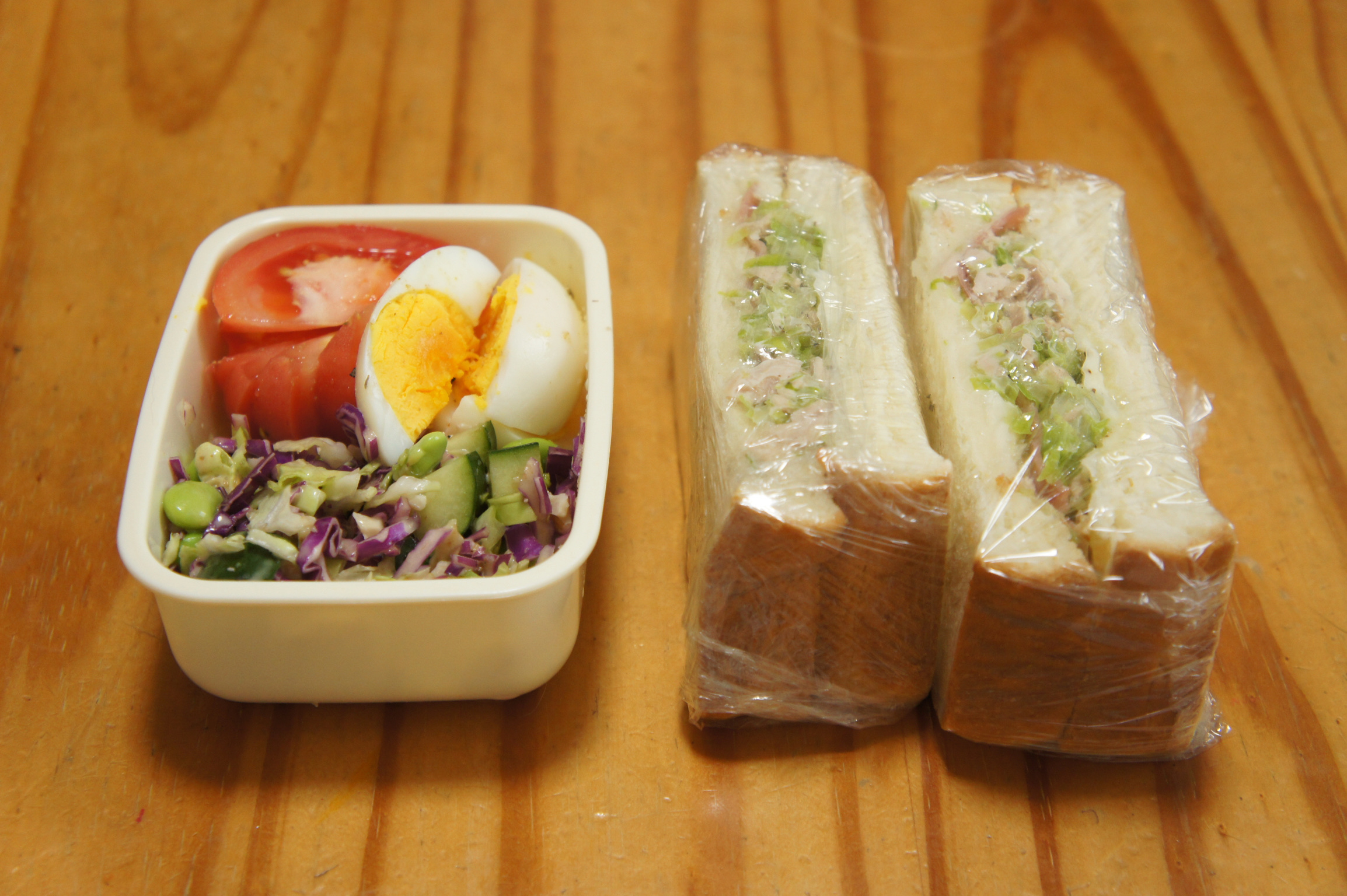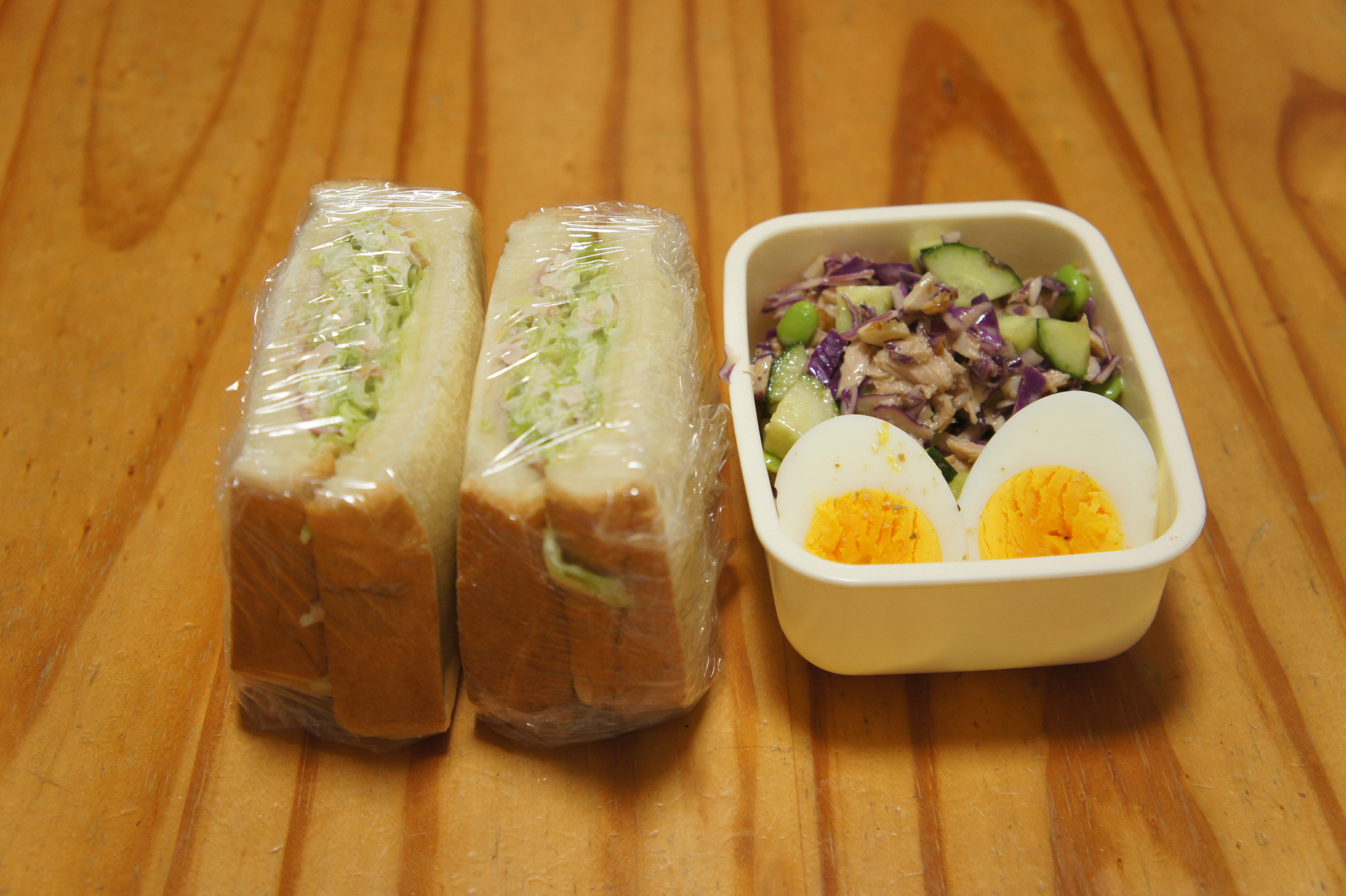 昨日と同じチョップドサラダとサンドイッチ。今日はトマトも追加しました。 赤キャベツときゅうりと枝豆のチョップドサラダゴマドレッシング和え トマト ゆで卵 キャベツとチーズのサンドイッチ