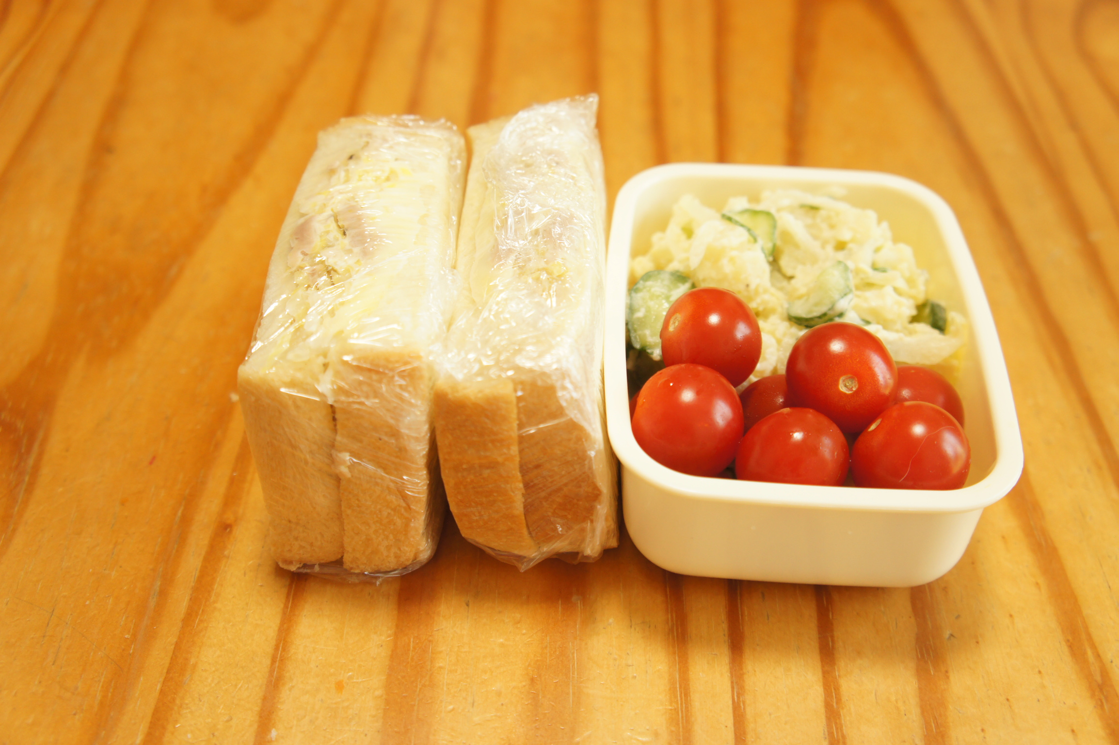 ポテトサラダにはヨーグルトも入れて、ちょっとヘルシーにして、味もよし。 チーズとキャベツのサンドイッチ ボテトサラダとミニトマトのサラダ