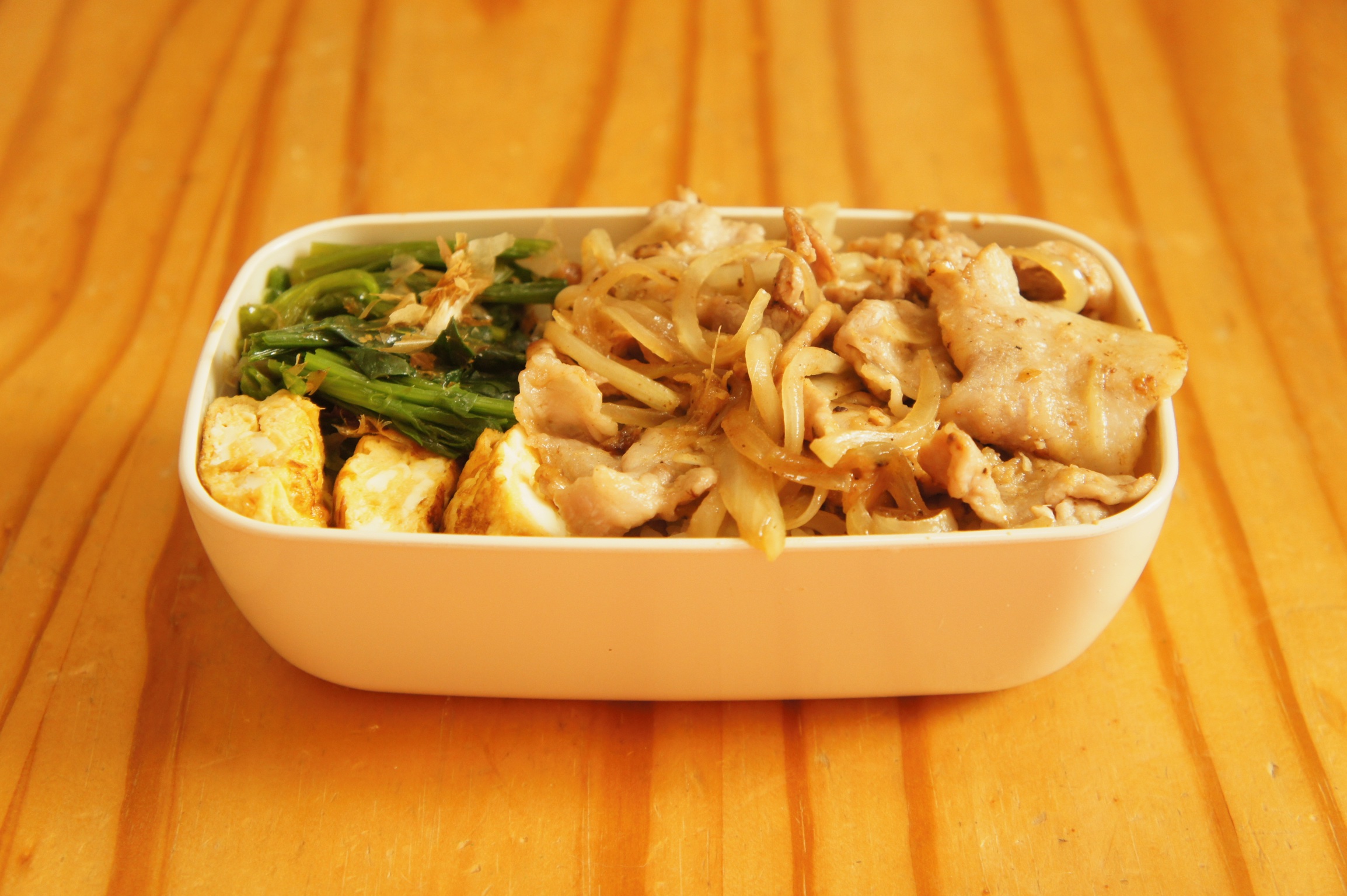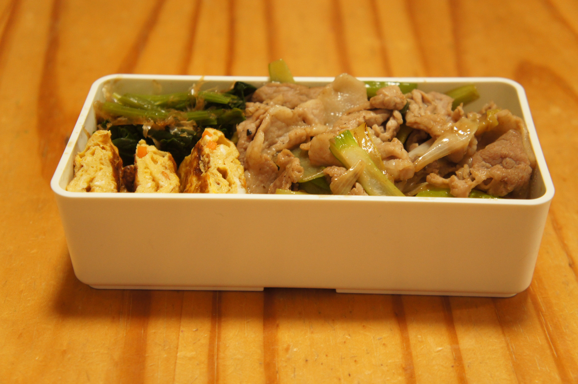 長ネギを買ったので、長ネギたっぷり入れて、にんにくも入れた豚の炒め物弁当。豚肉の下にご飯が埋もれてます。 豚と長ネギの炒め物 ほうれん草の麺つゆ炒め 卵焼き ご飯