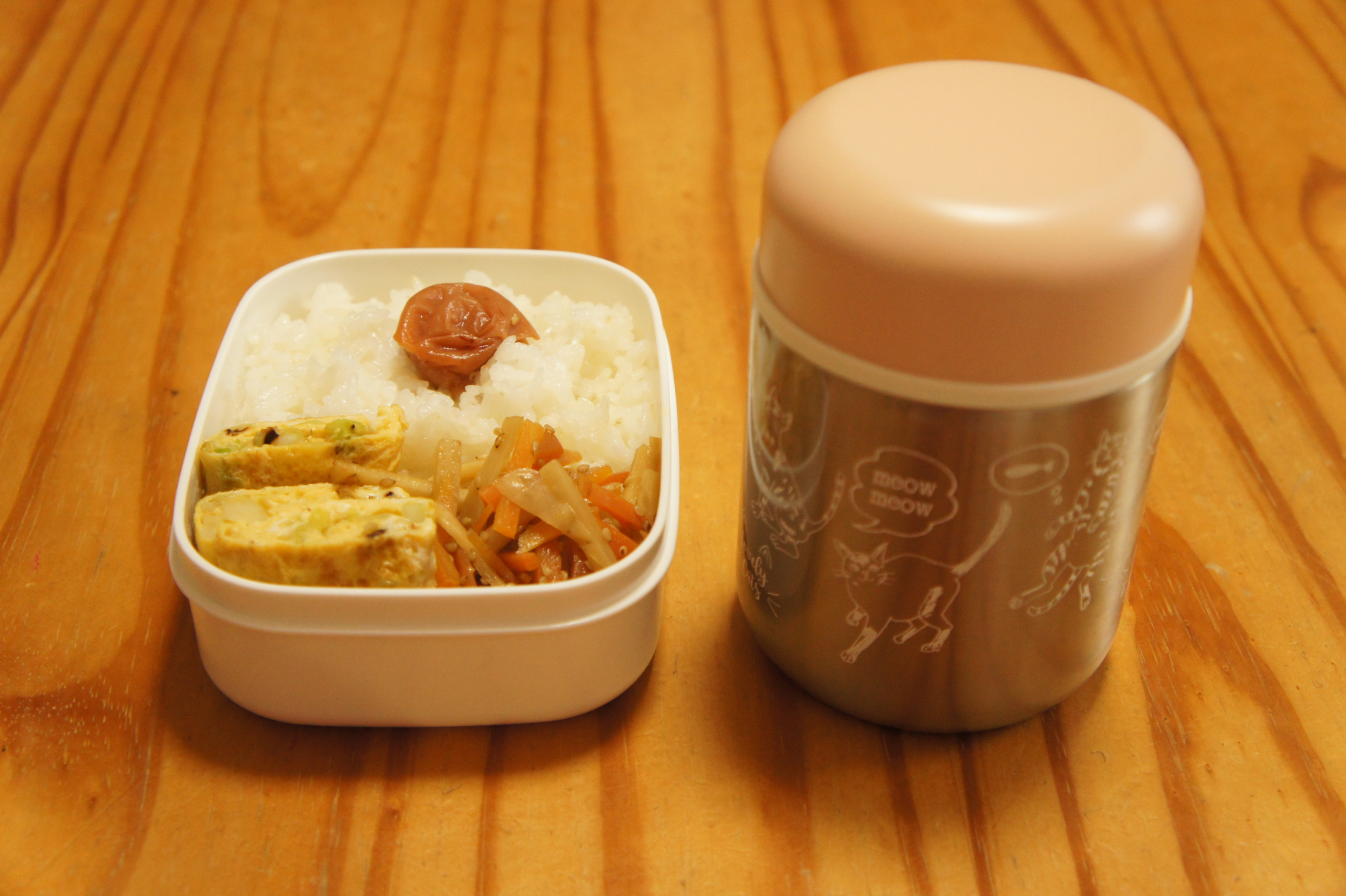 なんか寝坊してしまい、それでも意地で作ったお弁当。ちょっと少なめ。 長ネギとダイコンのお味噌汁 パセリ入り卵焼き 大根の皮とにんじんのきんぴら 梅干し ご飯 朝作ったのは卵焼きだけ。